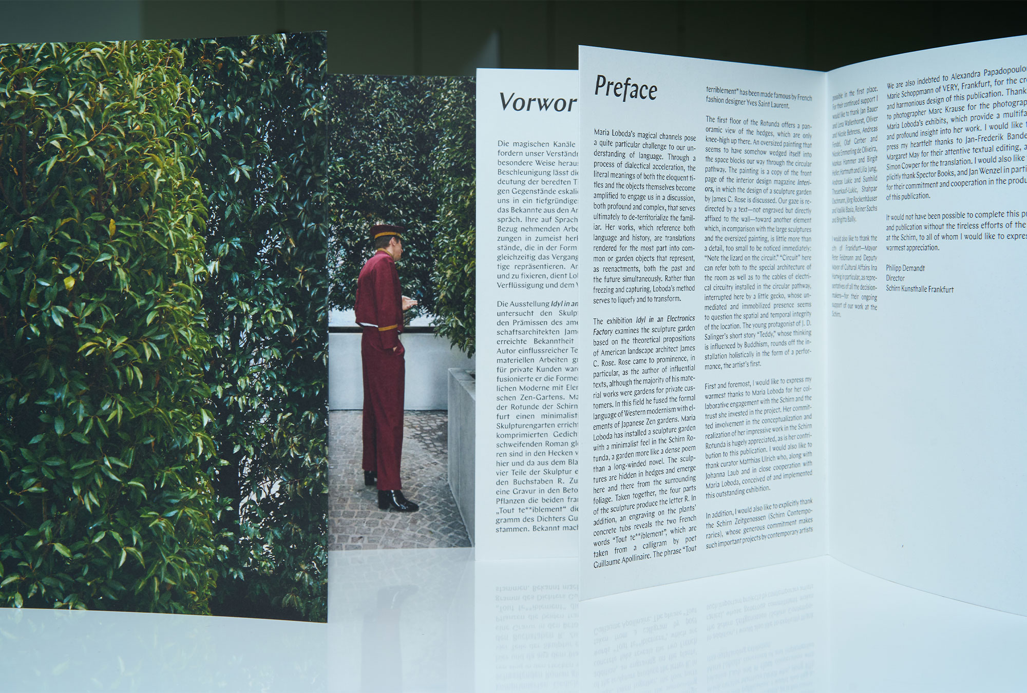 Maria Loboda hat eine neue Arbeit für die Rotunde der Schirn Kunsthalle Frankfurt entwickelt, eine Struktur, die für die Öffentlichkeit zugänglich ist: Tout terriblement besteht aus zwei Lorbeerhecken, die in den ersten Stock ragen, den Durchgang durch den Raum versperren und ihn in ein Labyrinth verwandeln. Die Hecken sind in Betonwannen eingelassen, in die der Künstler Buchstaben eingemeißelt hat. Zusammen ergeben sie „Tout te**iblement“, eine von Yves Saint Laurent populär gemachte Redewendung. Der Ausstellungstitel Idyl in an Electronics Factory ist eine Anspielung auf einen Artikel mit demselben Titel, der 1963 in der amerikanischen Designzeitschrift Interiors erschien. In dem Artikel wurde ein Entwurf des bahnbrechenden Landschaftsarchitekten James C. Rose kritisiert, der in seiner Praxis einen ganzheitlichen Ansatz verfolgte, bei dem belebte und unbelebte, veränderliche und unveränderliche Komponenten zum Einsatz kamen. Maria Loboda Idyl in an Electronics Factory, Rotunde in der Schirn Kunsthalle Frankfurt, vom 16. November 2018 bis 3. Februar 2019